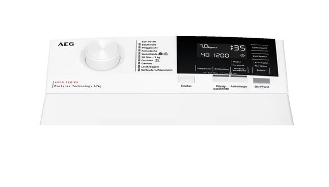 The AEG LTR6A60370 6000 ProSense Top Load Washing Machine offers a 7.0 kg capacity and a maximum spin speed of 1300 RPM. Featuring ProSense® technology, it automatically adjusts water, energy, and time consumption based on the load size. The large display with white LEDs and the SoftOpening system for a gentle drum lid ensure user-friendly comfort. Ideal for energy-efficient washing.
