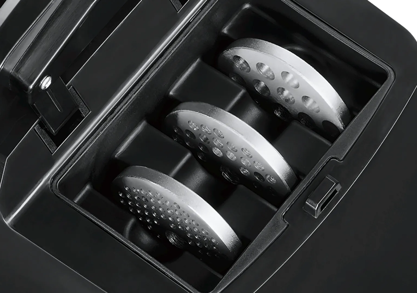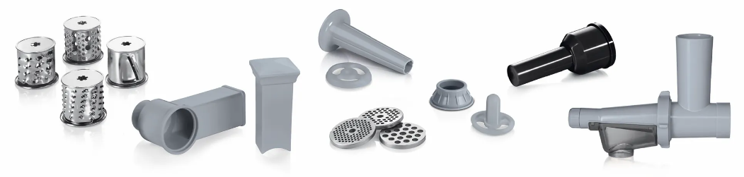 - Slicer attachment (drums for coarse grating, fine grating, slicing, and shredding)