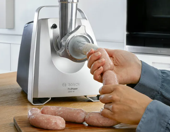High-performance Bosch MFW68660 ProPower Meat mincer with 2200 W blocking power. Processes 3 kg of meat per minute, includes reverse function, slicer attachment, and sausage adapter – ideal for quick and versatile preparation.
