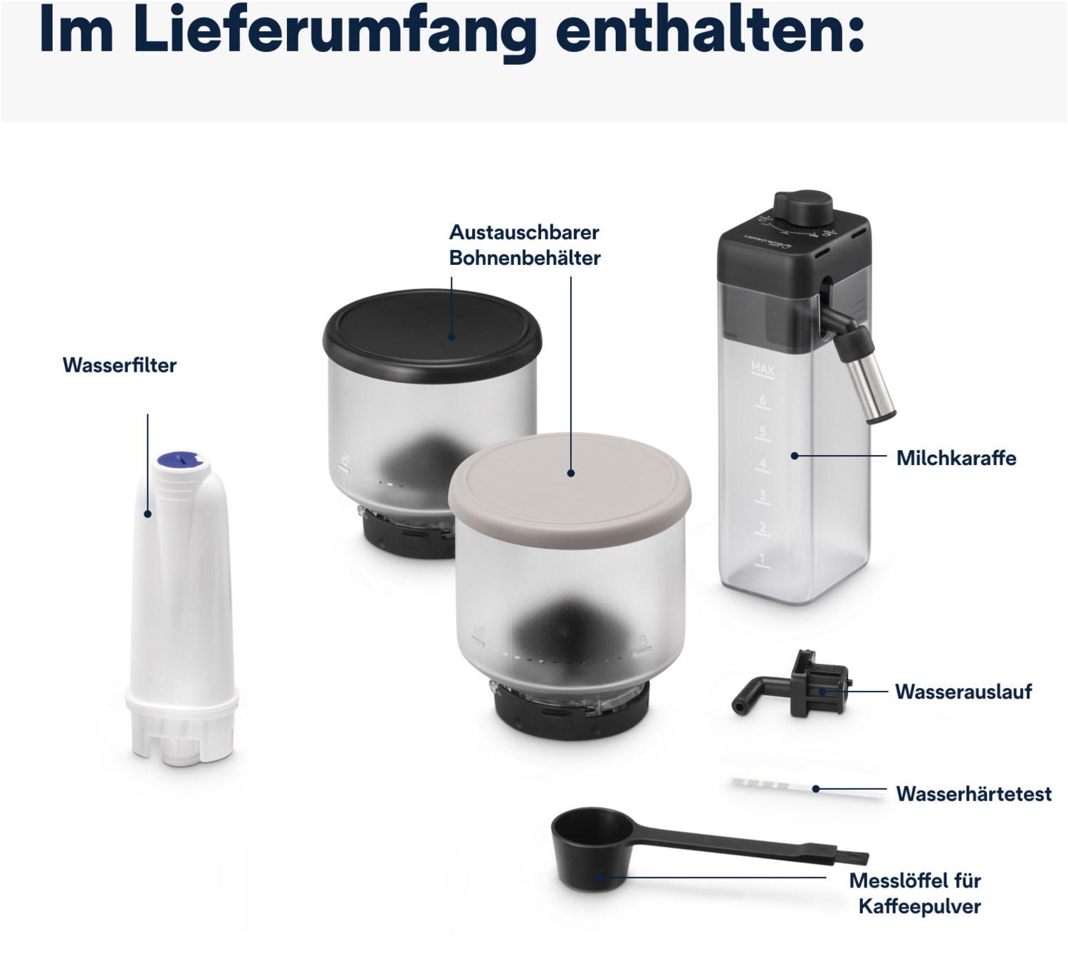 - Interchangeable 250g bean container in machine color (includes 2 containers: 1 in machine color and 1 in black)