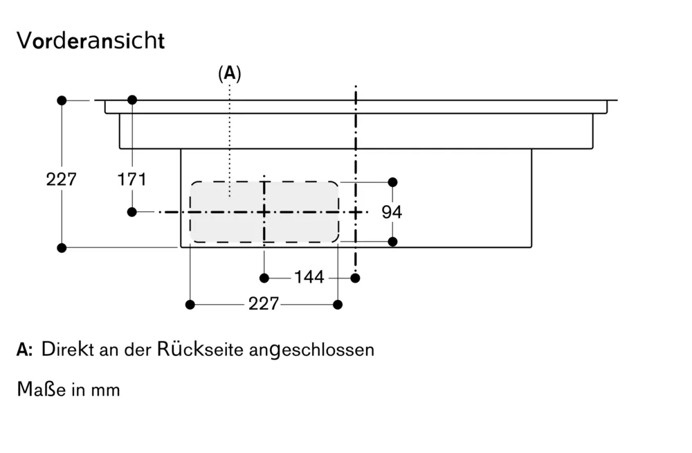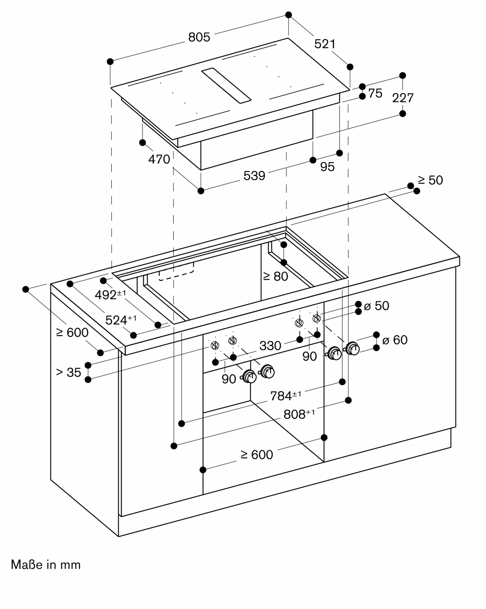 - Worktop depth: min. 60 cm with unguided recirculation, min. 65 cm with guided recirculation/exhaust air.