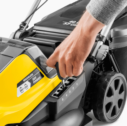 The Kärcher LMO 4-18 Dual Battery Set cordless lawn mower combines two 18 V batteries into a powerful 36 V unit – ideal for medium-sized gardens up to 450 m². The brushless motor delivers high performance and durability, while the intelligent iPower motor control automatically adjusts the speed. With a 37 cm cutting width, central height adjustment (25–65 mm), 2-in-1 mowing system (collection or mulching), and lawn combs for edge-close mowing, this mower offers maximum efficiency and comfort. Thanks to the foldable handlebar and integrated carry handle, it is compact and easy to transport. Batteries and fast chargers are included – ready to use immediately.