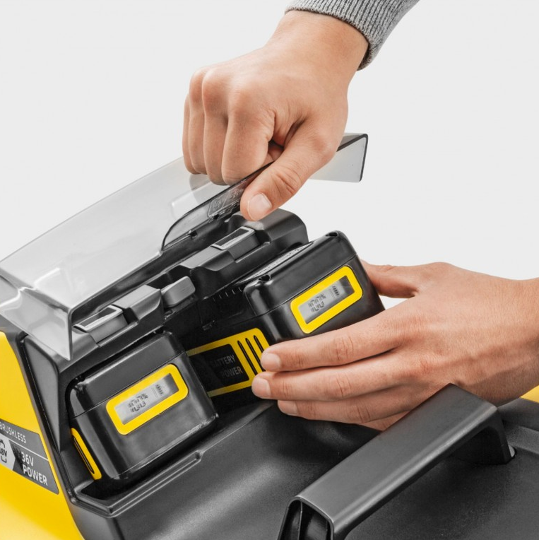 The Kärcher cordless lawn mower LMO 4-18 Dual is the perfect solution for lawns up to 450 m². Equipped with two 18 V batteries and a brushless 36 V motor, it delivers strong performance with low weight. The 37 cm cutting width and 5-level central cutting height adjustment (25–65 mm) ensure precise mowing, even on uneven terrain.