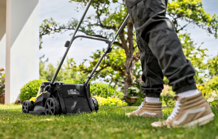 The height-adjustable handlebar and integrated carrying handle offer ergonomic comfort and easy handling. Thanks to its compact, foldable design, the mower can be stored space-saving and transported effortlessly.