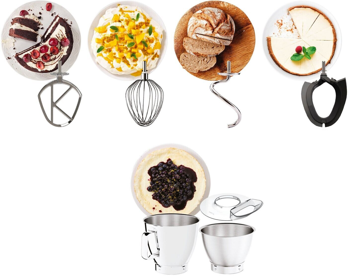 | Accessories | K-beater, dough hook, whisk, professional pastry hook, 2 mixing bowls, spatula, splash guard |