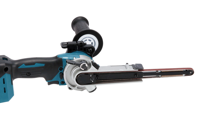Battery band file with 18 V drive for finishing and deburring in narrow places. Ideal for hard-to-reach contours, curves, weld seams etc. The abrasive belt can be changed quickly and easily by means of a quick-release fastener. Easy and safe guidance due to practical side handle.