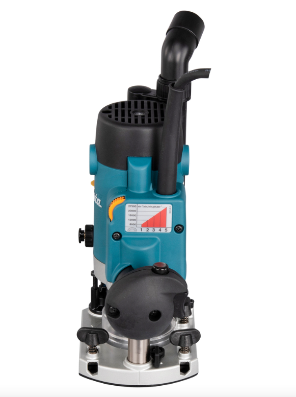 The Makita RP1111CJ router with 1,100 W delivers precise performance for decorative routing and small cutouts. With a speed range of 8,000–27,500 rpm and a restart protection feature, it offers comfortable handling, consistent speed under load, and a rubberized grip for a secure hold. Ideal for fine wood embellishments and routing grooves.