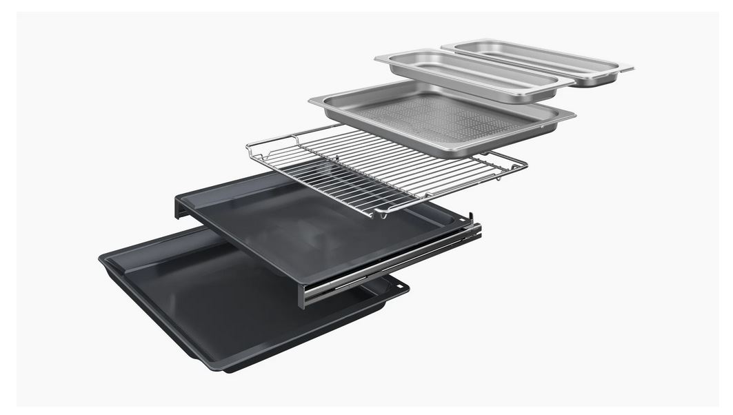 - Included: 1 enameled baking tray, 1 wire rack, 1 universal pan, 3 steam containers (various sizes), 1 sponge