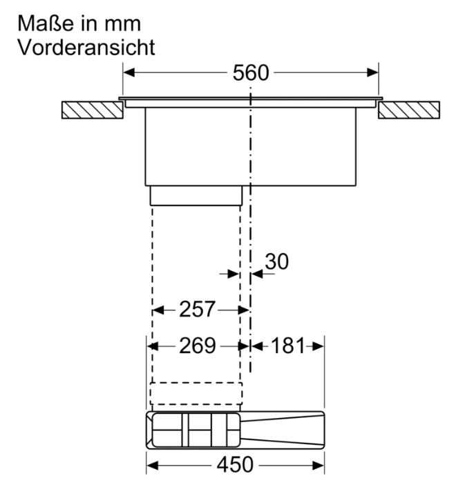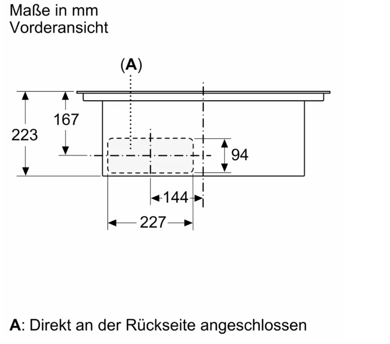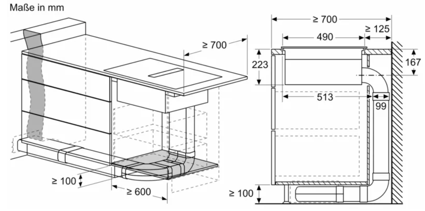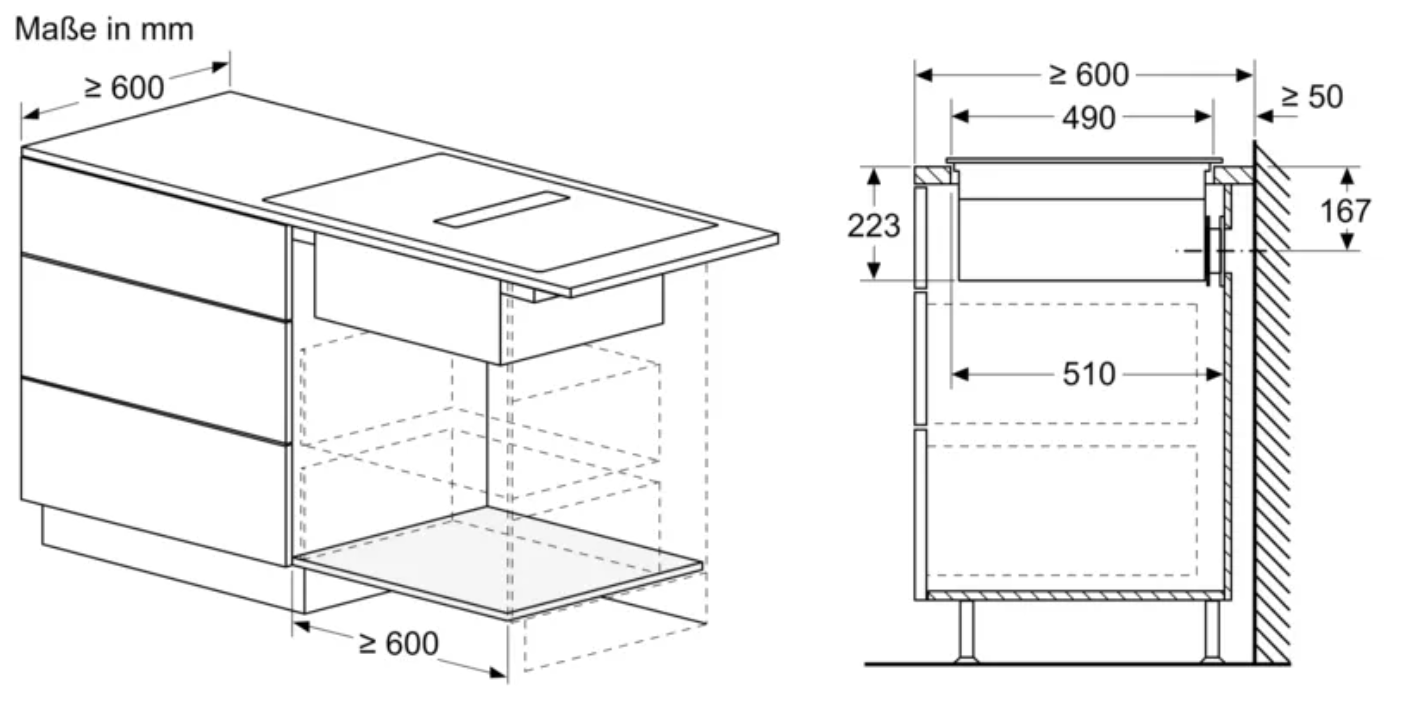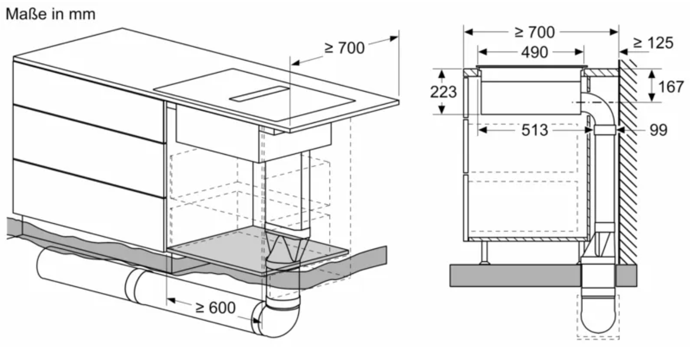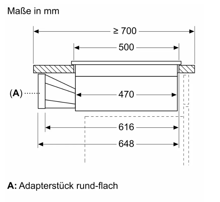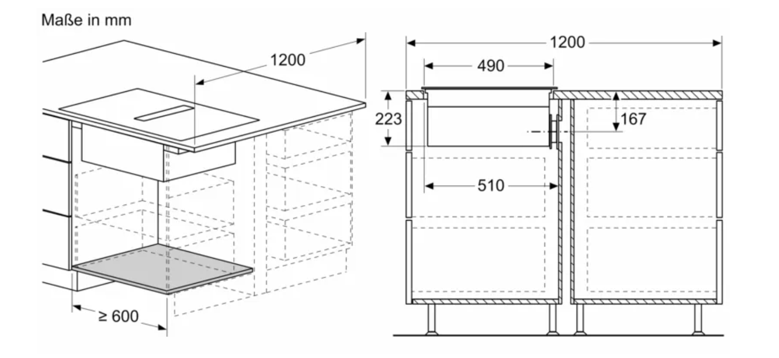 • 70 cm: Platz für 4 Töpfe oder Pfannen Flexibilität der Kochzonen • 2 Kombi Zonen: Bei Verwendung von größerem Kochgeschirr werden zwei Kochzonen zu einer größeren verbunden. • Kochzone vorne links: 190 mm, 210 mm, 2.5 kW (maximale Leistung 3.7 kW) • Kochzone hinten links: 190 mm, 210 mm, 2.5 kW (maximale Leistung 3.7 kW) • Kochzone hinten rechts: 190 mm, 210 mm, 2.5 kW (maximale Leistung 3.7 kW) • Kochzone vorne rechts: 190 mm, 210 mm, 2.5 kW (maximale Leistung 3.7 kW) Benutzerfreundlichkeit • touchSlider: Steuern Sie die Leistung direkt mit der aufgedruckten Touch-Leiste. • Favoriten-Taste: Mit einer konfigurierbaren Taste direkt auf Lieblingsfunktionen zugreifen. • 17 Leistungsstufen: Stellen Sie die Hitze mit 17 Leistungsstufen (9 Hauptstufen und 8 Zwischenstufen) präzise ein. • Warmhalte-Funktion, wählbar über Favoritentaste/Home Connect App (voraussichtliche Verfügbarkeit in Q4/2024 über Software-Update für mit Home Connect verbundene Geräte): Warmhalten von Speisen bei voreingestellter niedriger Leistungsstufe. • Abschalttimer: Schaltet die Kochzone am Ende der eingestellten Zeit aus (z. B. für gekochte Eier). • Wecker (kann anstelle des Abschalttimers ausgewählt werden): Ein Signal ertönt am Ende der eingestellten Zeit (z. B. beim Pastakochen). • Die Lautstärke der Signaltöne kann an die persönlichen Vorlieben und Bedürfnisse angepasst werden. Zeitersparnis und Effizienz • powerBoost-Funktion für alle Induktions-Kochzonen möglich: Mit 50 % mehr Leistung z. B. Wasser schneller zum Kochen bringen als auf höchster Leistungsstufe. • panBoost, wählbar über Favoritentaste/Home Connect App (voraussichtliche Verfügbarkeit in Q4/2024 über Software-Update für mit Home Connect verbundene Geräte): Erhitzt Pfannen schneller als auf höchster normaler Leistungsstufe und schützt gleichzeitig die Pfannenbeschichtung. • quickStart: Beim Einschalten wählt das Kochfeld automatisch die Kochzone aus, auf dem im ausgeschaltetem Zustand Kochgeschirr aufgesetzt wurde. • reStart: Im Falle von unbeabsichtigtem Ausschalten des Kochfeldes bleiben alle Einstellungen erhalten, wenn Sie innerhalb von 4 Sekunden wieder einschalten. Kochunterstützung • Bratsensor Pro mit 11 Temperaturstufen: Verhindert ein Anbrennen durch die automatische Temperaturregelung des Sensors. • Kochassistent: Einfach über die Home Connect-App die richtige Temperatureinstellung für ein bestimmtes Gericht finden. Konnektivität • Home Connect Funktion (WLAN): Überprüfen Sie, ob das Kochfeld auch dann ausgeschaltet ist, wenn Sie nicht zu Hause sind, und suchen Sie in der Home Connect-App nach Rezepten oder zusätzlichen Funktionen. • Smart Home Trigger (verfügbar mit verbundenem Home Connect-Konto): Öffnen Sie mit der Favoriten-Taste das intelligente Universum Ihres Kochfelds und steuern Sie andere Smart Home Geräte aus Ihrem Haushalt (Partnerservice erforderlich). • Aktualisierbares Gerät (verfügbar mit verbundenem Home Connect-Konto): Halten Sie das Gerät immer auf dem neuesten Stand der Software. Design • Rahmenlos Sicherheit • 2-stufige Restwärmeanzeige je Kochzone: Zeigt an, welche Kochzonen noch heiß oder warm sind. • Kindersicherung: Verhindert eine unbeabsichtigte Aktivierung des Kochfeldes. • Pause-Funktion: Unterbrechen Sie das Kochen, z. B. um die Haustür zu öffnen. • Hauptschalter: Alle Kochzonen auf einmal ausschalten. • Automatische Sicherheitsabschaltung: Aus Sicherheitsgründen schaltet sich das Kochfeld nach einer voreingestellten Zeit ohne Interaktion automatisch ab. Installation • Maße des Gerätes (HxBxT mm): 223 x 710 x 522 • Erforderliche Nischengröße (HxBxT mm): 223 x 560 x (490 - 490) • Minimale Arbeitsplattenstärke: 16 mm • Gesamtanschlusswert: 7400 W • powerManagement Funktion: Bei Bedarf die maximale Leistung begrenzen (abhängig von der Absicherung der Elektroinstallation). • Netzkabel: 110 cm, Anschlusskabel beigelegt in Verpackung Zubehör • cleanAir Plus Geruchsfilter, Teleskopschieberelement für Umluft beigelegt Integriertes Downdraft-Lüftungssystem • Induktionskochfeld mit vollintegriertem, leistungsstarkem Downdraft-Abzugsmodul. • Geeignet für Konfigurationen in Abluft oder Umluftmodus (inkl. differenzierter Softwaremodi). Installationszubehör für die ungeführte Umluft, darunter vier cleanAir Plus Geruchsfilter und ein Teleskop-Schiebeelement, sind im Lieferumfang des Kochfeldes enthalten. Zubehör für andere Einbaumöglichkeiten ist erhältlich, Details in den Planungshinweisen. • Ästhetisch integriertes, flächenbündiges Lufteinlassdesign mit schwebendem, hitzebeständigem Glaskeramikelement für freie Bewegung und Platzierung des Kochgeschirrs