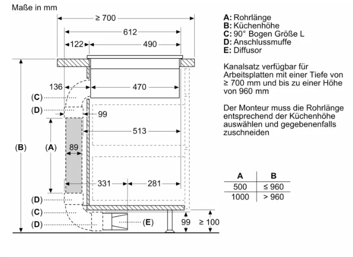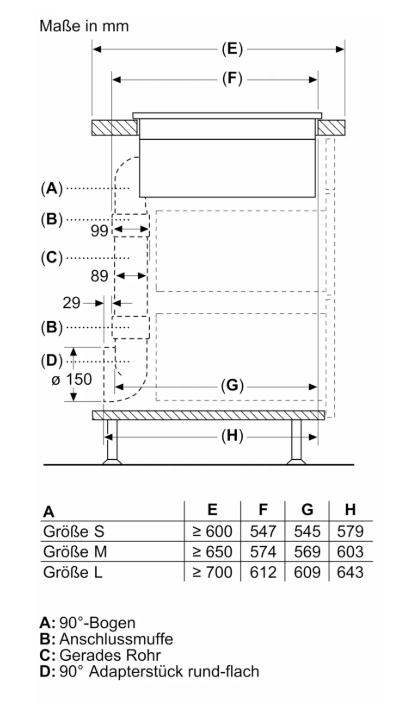 • Automatisches Einschalten des Lüftungssystem bei Nutzung einer Kochzone. • Automatische verzögerte Abschaltung nach dem Kochen, um Restgerüche nach dem Kochen zu beseitigen (in spezifischer ultra-geräuscharmer Ventilatorstufe, 12min (Abluft), 30min (Umluft), manuell abschaltbar) • Gebläsetechnologie mit hocheffizientem und geräuscharmen EcoSilence Drive Motor. Strömungstechnisch optimierte Luftführung im Innenraum • Einfaches Entnehmen und Reinigen der Fettfilter- und Überlaufschutzeinheit. • Bequeme Ein-Hand-Entnahme der Filter-Einheit. • Großflächige, 12-lagige Edelstahl-Fettfilter für hohe Fettfiltrationseffizienz (94 %). • Alle Teile sind einfach zu reinigen, spülmaschinengeeignet und hitzeresistent. • Kondensat- und Überlaufschutzbehälter, ca. 200 ml Aufnahmekapazität. • - Kondensat- und Überlaufschutzbehälter, ca. 200 ml Aufnahmekapazität • Sicherheitsüberlauftank (spülmaschinengeeignet) mit zusätzlichen 700 ml Aufnahmekapazität. Einfach zugänglich und von unten abnehmbar. • Insgesamt eine Aufnahmekapazität von 900 ml (200 ml + 700 ml) • Wasserdichtes Lüftungssystem • Dunstabzug Leistung: • Abluftleistung (nach EN 61591): min. Normalstufe 154 m3/h , max. Normalstufe 500 m3/h , max. Boost-/Intensivstufe 622 m3/h • Umluftleistung (nach EN 61591): min. Normalstufe 117 m3/h , max. Normalstufe 487 m3/h , max. Boost-/Intensivstufe 595 m3/h • Geräuschwerte bei Abluftbetrieb: min. Normalstufe 42 dB re 1 pW, max. Normalstufe 69 dB re 1 pW, max. Boost-/Intensivstufe 74 dB re 1 pW • Geräuschwerte bei Umluftbetrieb: min. Normalstufe 41 dB re 1 pW, max. Normalstufe 68 dB re 1 pW, max. Boost-/Intensivstufe 72 dB re 1 pW • Fettfilter-Effizienz: 94 % • Durchschnittlicher Energieverbrauch: 61,8 kWh/Jahr • Energie-Effizienzklasse: B (bei einer Skala der Energie-Effizienzklassen von A+++ bis D) • Lüftereffizienzklasse: A • Durchschnittlicher Energieverbrauch: 57 • Fettfilter-Effizienzklasse: B • Geräusch min./max. Normalstufe: 42 dB & 69 dB • Für Umluftkonfiguration: 2 x 2 Akkus direkt integrierter Geruchsfilter cleanAir Plus. • Optimierte Geruchsreduktion beim Kochen mit komplexen Geruchsmolekülketten (z. B. Fischgerüche). • Große Filteroberfläche mit hoher Geruchsreduktionsrate • Anti-Pollen-Funktion: Der Filter hält eine extrem hohe Menge an Pollen in der Luft zurück und deaktiviert die Allergene, die vom Filter zurückgehalten werden. • Filterstandzeit von 360 Std. bei intensivem Kochen (nicht regenerierbar) • Sehr geringes Geräusch mit optimierter Psychoakustik • Einfache Zugänglichkeit und einfache Entnahme von oben durch den Lufteinlass • CleanAir Plus Ersatzbedarffilterset HZ9VRCR1. • Bei Umluftbetrieb 2 x 2 direkt integrierte, leistungsstarke cleanAir Plus Umluftfilter Planungs- und Installationshinweise • Geeignet für Abluft- oder Umluftinstallationen in 4 verschiedenen Optionen (ungeführt, teilweise und vollständig geführte Umluft oder Abluft). Im Lieferumfang des Kochfeldes ist das Installationszubehör für ungeführte Umluft, darunter vier Geruchsfilter cleanAir Plus und ein Teleskopschieber, enthalten. Das mitgelieferte Zubehör ermöglicht eine einfache und schnelle Montage und ist in allen Arbeitsplattentiefen ≥60cm planbar. • Notwendig bei teil- und vollgeführter Umluft - immer als Geräteset bestellen! • Im Geräteset ist der erste relevante Bogen bereits enthalten: Arbeitsplattentiefe ≥ 60 cm - gekürzte Auszüge (90° „S“ Flachkanalbogen HZ9VDSB4, männlich) Arbeitsplattentiefe ≥ 70 cm - Standardauszüge (90° „L“ Flachkanalbogen HZ9VDSB2, männlich) Für eine teilgeführte Umluft bis in den Sockelbereich bieten wir eine Vorzugsverrohrung als Zubehör-Set HZ9VDKR2 an (ausgelegt für eine Arbeitshöhe bis zu 960 mm). Für eine individuelle vollgeführte Umluft steht umfangreiches Sonderzubehör zur Verfügung. • Notwendig bei Abluft - immer als Geräteset bestellen! • Im Geräteset ist der erste relevante Bogen bereits enthalten: Arbeitsplattentiefe ≥ 60 cm - gekürzte Auszüge (90° „S“ Flachkanalbogen HZ9VDSB4, männlich) Arbeitsplattentiefe ≥ 70 cm - Standardauszüge (90° „L“ Flachkanalbogen HZ9VDSB2, männlich) Weiteres Zubehör für die Luftführung muss auf Basis der individuellen Planung gesondert bestellt werden. Hierzu bieten wir umfangreiches Zubehör an. • Zur Vervollständigung der vollkgeführten Umluft oder für jede andere individuelle Umluftplanung ist verschiedenes Kanalzubehör erhältlich. • Planungshinweise: • Die Planung ist möglich als Wand- und Inselplanung • Das Produkt und die Zubehöre erfüllen die Bestimmungen des Nadelflammtest (gemäß IEC 60695-11-5) und die Baustoffklasse B1 (nach DIN 4102-1). • Ausnahme: Das Zubehör HZ9VDSS2 Flexmanschette erfüllt den Nadelflammtest (nach IEC 60695-11-5) und die Baustoffklasse B2 (nach DIN 4102-1). • Die maximale Eintauchtiefe beträgt 223 mm unter Glas für aufsatzmontierte Geräte und 227 mm für Geräte, die für den flächenbündigen Einbau geeignet sind (modellabhängig). • Das Gerät muss von unten frei zugänglich bleiben • Es ist kein Zwischenboden unter dem Gerät notwendig. Die Schubladen müssen entnehmbar sein. Die Rückwand kann gelassen werden - es wir lediglich ein Ausschnitt für den Luftaustritt (Position und Größe können den Installationsanweisungen entnommen werden) benötigt. • Eine Installation in ungeführter Umluft erfordert eine vertikale Öffnung von min. 25 mm hinter der Rückwand der Möbel. Für eine optimale Leistung werden 50 mm empfohlen. • Die minimale Arbeitsplattenstärke beträgt 16 mm für aufsatzmontierte und flächenbündig montierte Geräte mit dem Standard Installationssystem. • Das Gesamtgerätegewicht beträgt 26 kg. Die Tragfähigkeit und Stabilität insbesondere bei dünnen Arbeitsplatten ist durch geeignete Unterkonstruktionen sicherzustellen. Hierbei sind das Gerätegewicht (mitsamt entsprechende